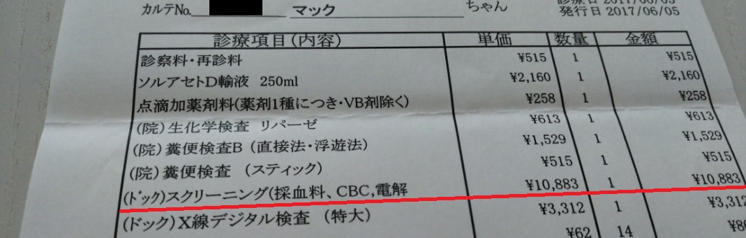 Mackの場合、検査当時18歳の高齢だったので検査項目も多く、1万円を超える請求がありましたが、もっと若い場合はもう少し安くなると思います。