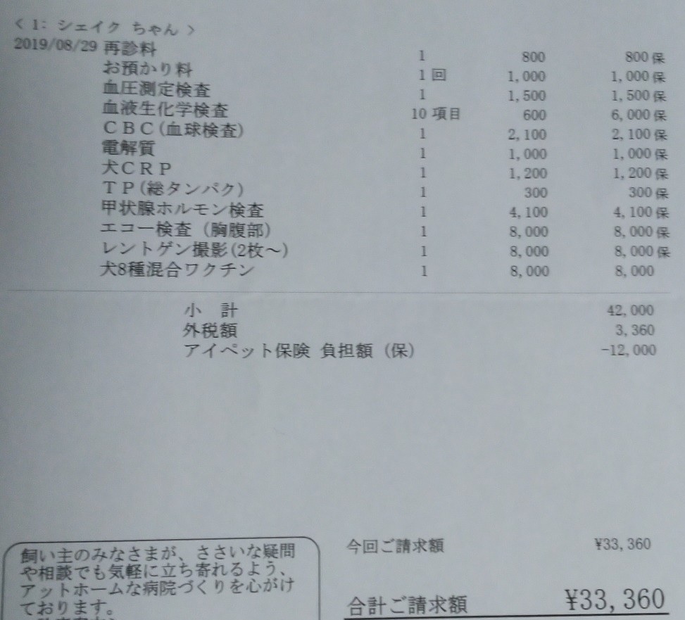 Shakeの場合、聴診で異常を認められた心臓を主に検査するメニューを組んだので請求が大きくなりました。