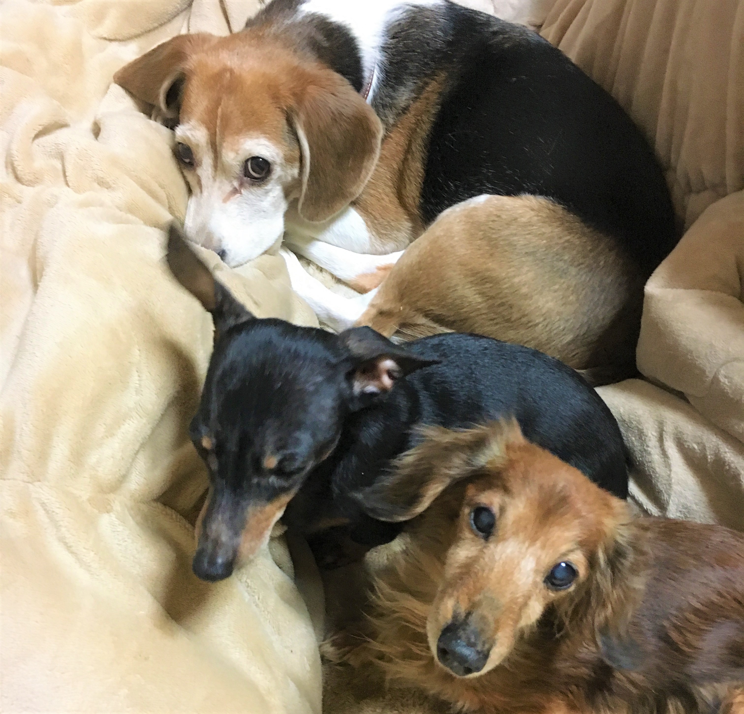 愛犬情報 犬種:ミニチュアダックスフンド2頭、ビーグル1頭 飼い主の悩み:多頭飼い 年齢:18歳・15歳・8歳(2018年3月...